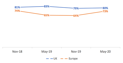 European business leader nerves were less jittery last autumn compared to their counterparts in the UK. However, despite European risk perception dropping nine percentage points since November ‘19, risk concerns are predicted to rise again by May ’20 when the impact of Brexit is likely to bite.