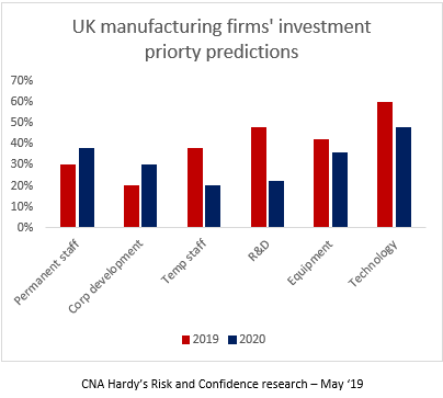 As we look ahead, manufacturers are caught in a cleft stick. Some 60% say they plan to invest in technology to transform productivity in 2020. But, on the flip side, this increasing reliance means that tech risk also tops manufacturers’ risk list in 2020, knocking political risk off the current top spot.