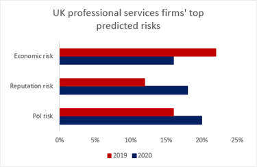 The UK is the centre of European professional services, and many firms operate in Europe under the current passporting rules. The uncertainties around how these will continue after Brexit seem to be weighing on professional services firms, which place political risk firmly at the top of their list of worries for 2020.