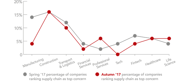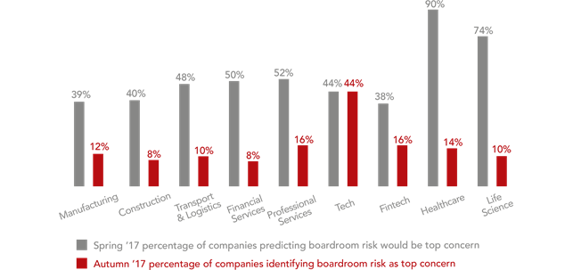 55% of business leaders in Spring ’17 predicted boardroom risks (a combination of corporate, supply chain and compliance risk) would be their major concern by Autumn ‘17, but today only 22% of businesses gave it a top ranking. The only sector where business leaders held fast to their belief that boardroom risk would be their top concern was Tech.