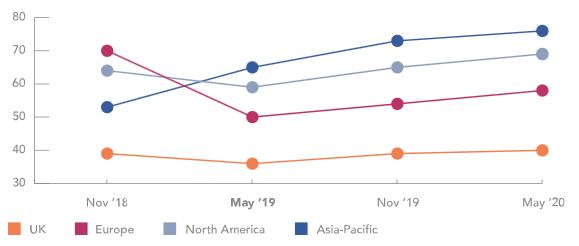 - By May ‘20, over a fifth of global business leaders predict that Asia will be the region that has the greatest capacity to drive their growth, putting it well ahead of the global pack.