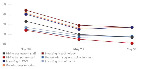 Against this backdrop, the rate of investment in business fundamentals has fallen dramatically in the six months to May ’19, with investment in talent and research & development (R&D) among the hardest hit areas. Dave Brosnan comments: “Uncertainty is a key driver of high levels of caution about investment in business fundamentals. Companies are simply not prepared to put capital at risk in an environment where unpredictability reigns. The inevitable, but extremely damaging consequence is that fewer companies are maintaining investment in technology, R&D and talent to support the top line.”