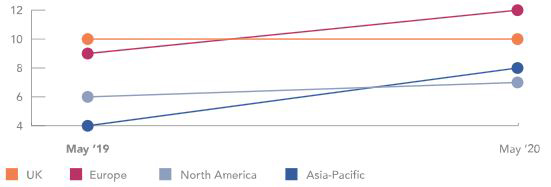As business leaders look ahead to May ‘20, we see that reputation risk is growing faster than any other – up 29% globally, a third (33%) in Europe and doubling in Asia Pacific between May ‘19 and May ‘20.
