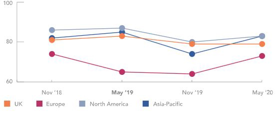 - For business confidence, the UK remains bottom across all surveyed regions. Europe, which led the world in terms of confidence six months ago, is now the least confident region globally after the UK.