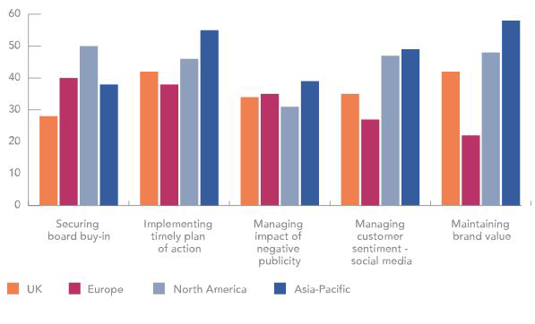 Businesses we spoke to were divided regarding the most significant challenges they face when dealing with brand or reputation risk. Managing the logistical challenges – securing board buy-in and implementing a timely plan of action – were two of the highest ranked priorities. But maintaining brand value was narrowly the top concern globally, with sentiment particularly marked in Asia Pacific and North America.