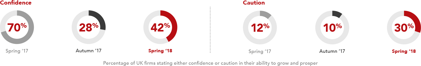 - With risk on the rise, confidence remains muted. Fewer than half of leaders (42%) are currently confident in the ability of their business to grow and prosper and almost one third (30%) are actively cautious as business leaders look ahead to Autumn ’18.